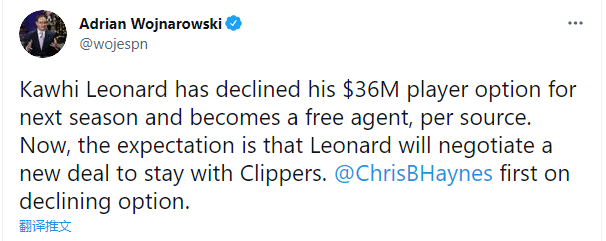 来源:JRS直播网08-02 10:08JRS直播网讯 北京时间8月2日,据ESPN名记沃纳罗斯基报道,快船球员莱昂纳德已经拒绝执行下赛季3600万美元的球员选项,这使其成为完全自由球员;预计他将和快船重新签下一份合同。