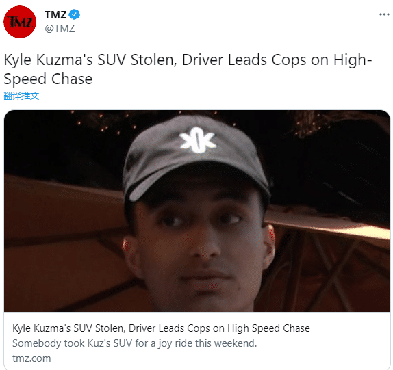 据美媒报道,库兹马的雪佛兰SUV在好莱坞附近被盗,在当时时间周日凌晨1:30左右,警方追捕该犯罪嫌疑人。在追捕过程中,嫌疑人开车撞上了一辆警车,并导致一名警察受伤,该警察已经被送往医院,似乎是腿受伤,被抬上担架并被救护车接走。