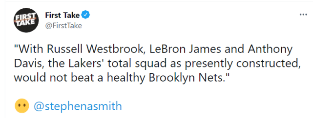 “拉塞尔-威斯布鲁克、勒布朗-詹姆斯和安东尼-戴维斯,湖人目前构造的这支球队,将无法击败一支健康的布鲁克林篮网,”史密斯说道。