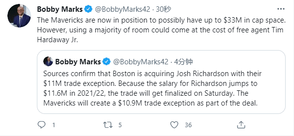 交易过后独行侠获得一个1090万美元的交易特例;现在独行侠已经创造出3300万美元的薪资空间,为后续操作做准备,续约小哈达威以及引援升级阵容;据名记Marc Stein报道,独行侠休赛期A计划是引进洛瑞和续约小哈达威。