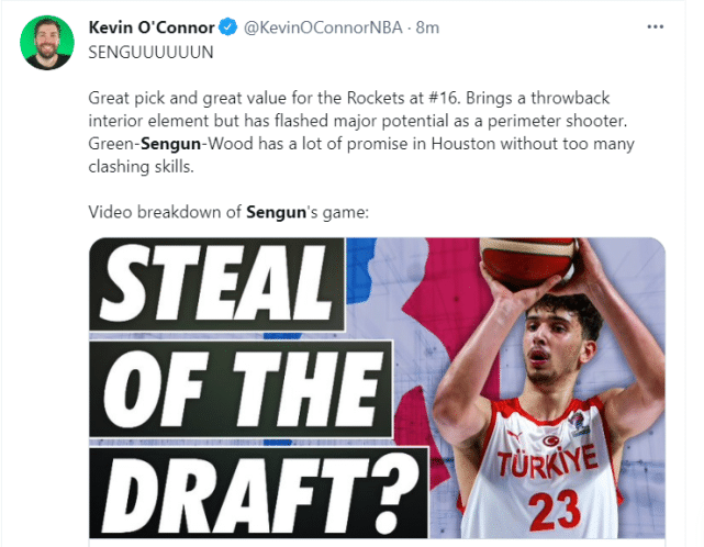 火箭16号签选中土耳其MVP!休城捡漏2米08内线 名记感慨大赚