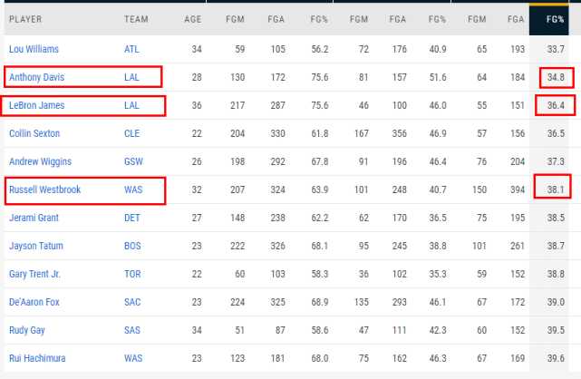 这还没完,官网还给出了中投命中率的排名数据。2020-21赛季,全联盟至少出手150次中投的球员里,一共有12位的中投命中率不到40%,而湖人新三巨头都在其中。浓眉是34.8%,在12人中排名倒数第二,只比路威强一点。詹姆斯(36.4%)是倒数第三,威少(38.1%)是倒数第六。