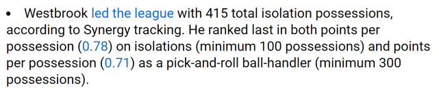 官网指出,威少不但投篮很铁,而且单打和挡拆得分效率很差。上赛季,威少累计415次持球单打,是全联盟单打次数最多的球员。可是在至少单打100次的球员里,威少每回合单打得分仅为0.78分,排名垫底。当他作为挡拆发起者时,他的每回合得分仅为0.71分,在所谓至少挡拆300回合的球员里也是倒数第一。