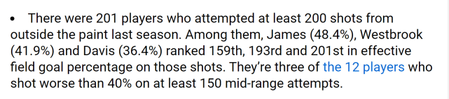 官网指出,2020-21赛季全联盟一共有201名球员在禁区外至少出手200次投篮,在这201名球员里,詹姆斯(48.4%)、威少(41.9%)和浓眉(36.4%)分别排在有效命中率的第159位、第193位和第201位。没想到,浓眉竟然排名倒数第一,比威少还铁。