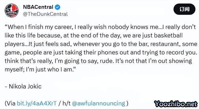在节目中,约基奇大吐苦水,表示非常不喜欢现在的生活。约基奇表示:“当我结束我的职业生涯时,我真的希望没有人认识我……我真的不喜欢这种生活,因为归根结底,我们只是篮球运动员……每当你去酒吧、餐厅时,我都会感到悲伤,人们拿出手机试图给你录音。我想说,我认为这真的很粗鲁。”