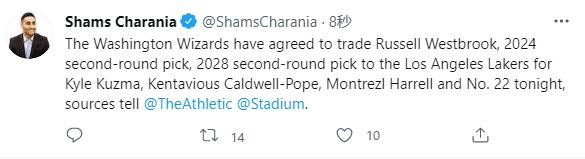 来源:JRS直播网07-30 11:39JRS直播网讯 北京时间7月30日,据名记报道,湖人和奇才关于威少的交易已经达成,威少新赛季将于詹姆斯并肩作战。