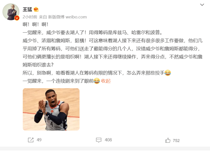 湖人4换3得到威少!联手詹眉冲击总冠军,王猛:好奇湖人接下来怎么办?