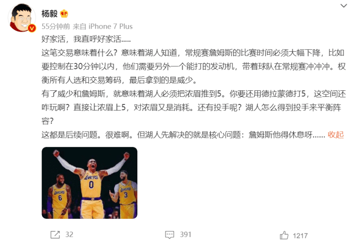 威少连续三年被交易创历史!老詹更新社媒暗示,杨毅:湖人没想后续啊!
