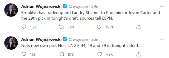 来源:JRS直播网07-30 11:32JRS直播网讯 北京时间7月30日,据ESPN名记沃纳罗斯基报道,篮网和太阳达成了一笔1换2的交易协议。他们将沙梅特送至太阳,换回杰文-卡特和今年的29号签。这样一来,篮网在今天的选秀大会上拥有27号签、29号签、44号签、49号签和59号签。