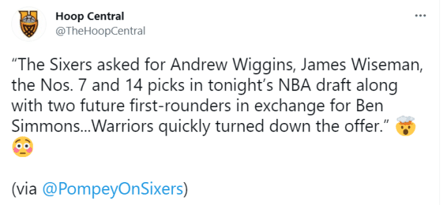维金斯+怀斯曼+4首轮!西蒙斯1换6报价遭勇士拒绝,76人连续碰壁