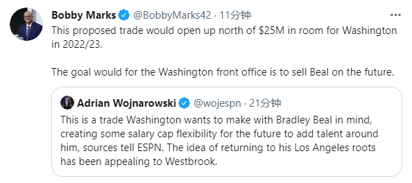 名记沃纳罗斯基表示,这是奇才希望能让比尔满意的交易,球队通过这个交易可以获得未来薪资空间上的灵活性,从而为比尔引援新的帮手;Bbbby Marks报道,这笔交易能让奇才在2022-23赛季获得2500万美元的薪资空间。