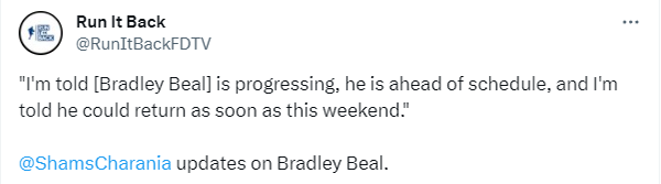 名记Shams在《Run It Back》节目中谈到了比尔的伤情,他说道:由于近期战绩不佳,太阳上下都出现了失望的情绪,无论是球员、教练组都是如此。现在他们急需赢球,赢球就需要球星回归。我被告知比尔的康复已取得进展,他的复出时间会比原时间表提前。他最快本周末就可以复出,有可能会是在周六对阵黄蜂的比赛,也有可能是在下周一对阵魔术。