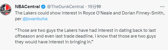 湖人随队记者Jovan Buha在节目中谈到了球队的交易方向,他表示:我不认为湖人能得到一位能让他们赶上掘金、绿军水准的第三号球星。在我看来,湖人应该正在寻求一次小升级。3D侧翼一直是这支球队最大的问题,湖人一直没能找到库兹马、KCP、丹尼-格林、卡鲁索的替代者。湖人会想要一个出色的3D,可能还不止一个,比如罗伊斯-奥尼尔和多里安 芬尼-史密斯。在上赛季交易截止日前,湖人就对他们俩感兴趣。据我所知,现在湖人依旧有兴趣引进这两位球员。