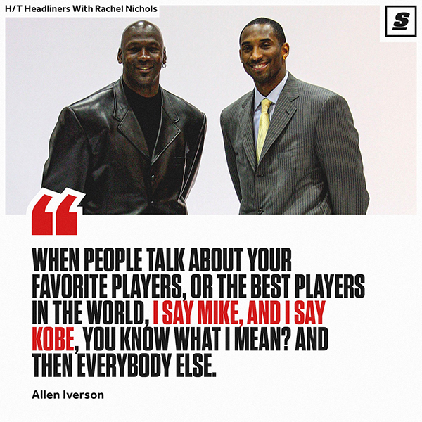 艾弗森还表示詹姆斯在这剩余的其他人之中,换言之,在艾弗森心目中的历史最强球员名单中,詹姆斯是排在乔丹和科比之后。