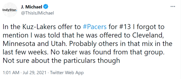 来源:JRS直播网07-29 10:30JRS直播网讯 北京时间7月29日,据NBA记者J-迈克尔报道,湖人用库兹马向骑士、森林狼和爵士进行交易报价,但均遭到拒绝,而此前报道称,湖人用库兹马和22号签报价步行者的13号签,同样被拒绝。这样一来,至少四支球队拒绝了湖人关于库兹马的报价。