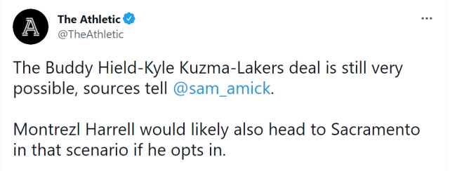 看上去无人问津的库兹马,或许最终还是会被送走,美媒解析,最可能成为他下家的球队是国王。The Athletic名记萨姆-阿米克报道称,湖人仍然非常有可能得到国王的希尔德,而他们送出的筹码将有可能包括库兹马、哈雷尔(执行球员选项)和22号签。