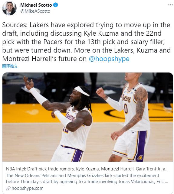 另外湖人仍在尽全力追求强援,库兹马、哈雷尔、选秀权、施罗德等人都是球队的交易筹码,目前已经明确摆上了货架!据NBA记者Michael Scotto报道,消息人士透露,湖人希望打包库兹马加22号签换步行者的13号签,但是被后者拒绝,库兹马这是自己把自己身价打没了啊!
