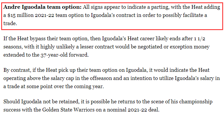 答案太明显了,热火选择不执行合同的概率最高,让伊戈达拉恢复自由身并且决定自己的下一站,按照伊戈达拉当前的水准,他非常适合承担更衣室老将的角色,但热火既然不选择执行合同,就代表了热火和伊戈达拉的分手在所难免,对于伊戈达拉的下一站,热火记者Ira Winderman明确表示伊戈达拉最有可能以一份象征性合同回归勇士,也就说勇士会给到伊戈达拉一份老将底薪。