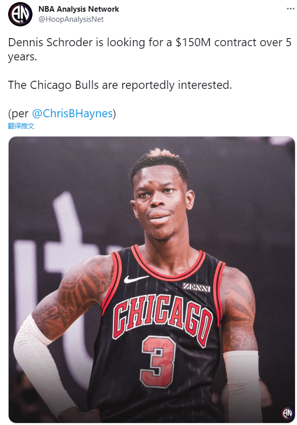 来源:JRS直播网07-27 15:25JRS直播网讯北京时间7月27日,据名记ChrisHaynes的报道,湖人球员丹尼斯-施罗德正在寻找一份5年1.5亿美元的续约大合同,平均年薪高达3000万美元;名记还透露芝加哥公牛有意引援施罗德。