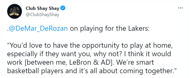 “你不能问一个孩子是否想要回家乡打球,然后认为他会说不。你会很开心拥有回家打球的机会,特别是如果他们需要你,为什么不呢?这是一次很好的机会。我认为那会奏效(指自己和詹姆斯、浓眉的组合)。我们都是聪明的篮球运动员,关键就是要团结在一起。”德罗赞在节目上说道。