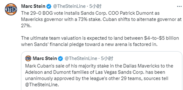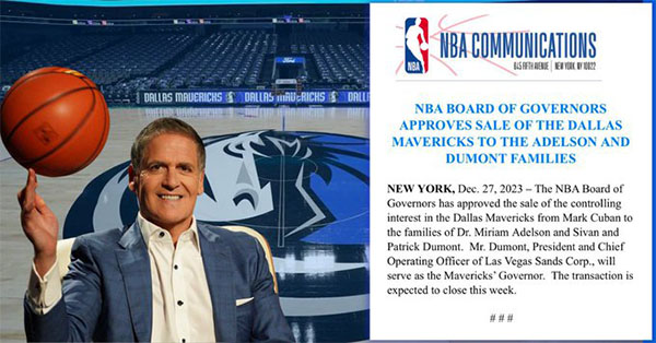 NBA官方正式宣布,联盟其他29支球队已经同意马克-库班将独行侠大部分股权出售给博彩业大亨阿德尔森家族,这次投票结果为29-0,NBA董事会全票同意。
