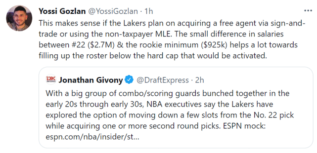 专家戈兹兰解析道,湖人如果想通过先签后换得到一名自由球员,或者使用全额中产特例,这样操作就很有意义。别看22号秀的薪水(270万美元)和新秀底薪(92.5万美元)之间差距不大,但很可能会决定湖人的硬帽是否被触发。