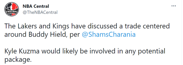 查拉尼亚报道称,湖人和国王已经进行了一笔关于巴迪-希尔德的交易谈判,消息源透露,库兹马在湖人的报价方案中。不少球队对库兹马感兴趣。以薪金配平的角度来说,库兹马无法单独用来换希尔德,但他将是报价中的关键组成部分。沃纳罗斯基报道称,除了库兹马,湖人还向不少球队兜售波普。