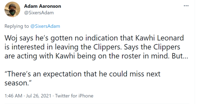 来源:JRS直播网07-26 10:20JRS直播网讯 北京时间7月26日,ESPN名记沃纳罗斯基在最新一期节目上透露,科怀-莱昂纳德没有兴趣离开快船,快船的运作也是按照小卡会留在阵中进行的。不过,沃纳罗斯基也表示,小卡预计会缺席下个赛季。换言之,2021-22赛季,小卡很可能因伤赛季报销。