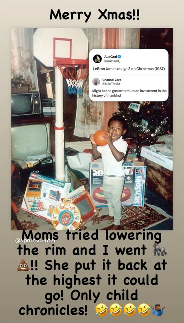 不久前,詹姆斯把自己的Ins账号头像换成了自己的3岁扣篮照;此前老詹表示这个儿童篮球架是他在3岁时收到的圣诞礼物,老詹晒3岁时期抱球照并且配文写道:圣诞快乐!我妈妈尝试过降低篮筐高度,然后我就抓狂了!她就把篮筐升回可以达到的最高高度!只有童年才有的趣闻!