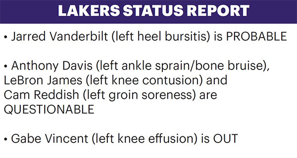 湖人公布对阵黄蜂伤情,詹姆斯、浓眉和雷迪什都被列为出战成疑,范德彪大概率出战,文森特继续休战(确定手术,预计伤停6-8周)。