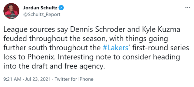 来源:JRS直播网07-23 11:43JRS直播网讯 北京时间7月23日,据ESPN记者Jordan Schultz爆料,联盟消息源透露,湖人球员施罗德和库兹马整个赛季的关系都不好,两人在征战季后赛首轮时关系进一步恶化。Schultz的爆料引起热议,不少球迷建议湖人还是把两个球员都送走,避免影响球队的化学反应。