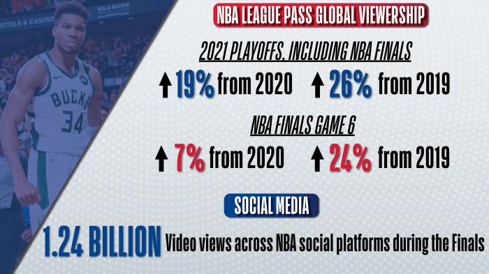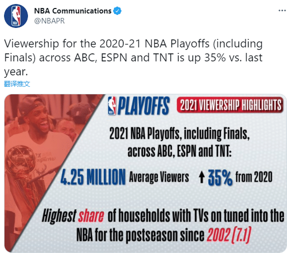 2021年全球收视率比去年增长19%,比19年增长了26%,NBA总决赛G6收视率比去年增长7%,比前年增长24%;总决赛六场比赛的总收视高达12.4亿,平均每场收视2000万。