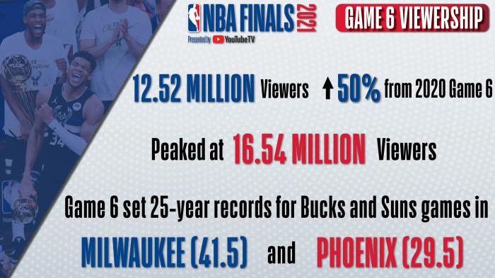 总决赛G6的收视是1252万,比去年总决赛第六场增加了50%,高峰期收视高达1654万,创造了雄鹿对阵太阳近25年收视记录。