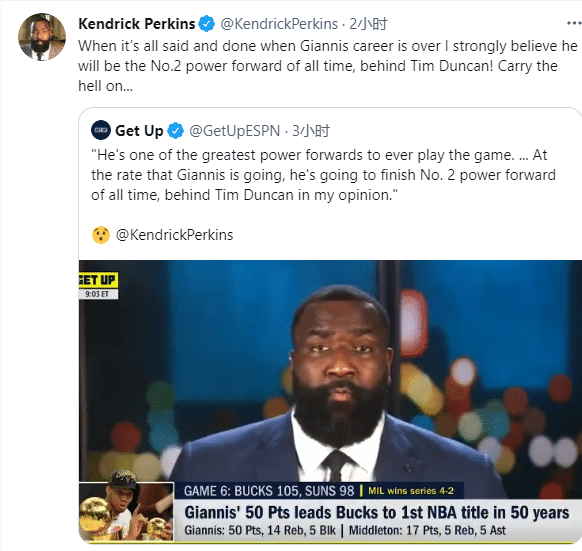 名嘴帕金斯表示:字母哥是有史以来最伟大的大前锋之一,按他的成长速度,在他职业生涯结束时,他将成为有史以来排名第二的大前锋,仅次于蒂姆-邓肯!