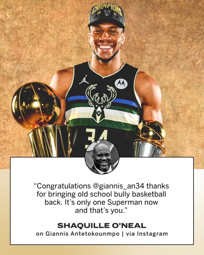 奥尼尔表示:恭喜扬尼斯夺冠,感谢你把老牌式篮球带回来了,现在联盟仅仅只有你一位超人。