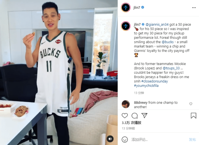 不久前,林书豪穿着大洛的11号球衣,更新社交媒体,写道:字母哥买了50个鸡块,我受到启发买了30个鸡块,尽管雄鹿是一个小市场球队,但他们赢得了总冠军,字母哥的忠诚为城市换来总冠军;为我的前队友大洛而开心,大洛的球衣对我来说就像一件裙子似的。