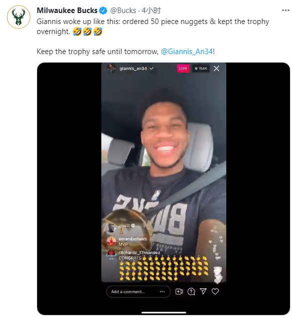 值得一提的是,不久前字母哥在车中抱着总冠军和FMVP两座奖杯,前往炸鸡店买鸡块,明确表示只要50个鸡块,途中字母哥还遇到雄鹿球迷,后者再次高呼MVP和雄鹿6场拿下的口号;这家店的老板表示,若字母哥能带领雄鹿下赛季再夺冠,以后他在这里吃鸡块就不用付钱了。