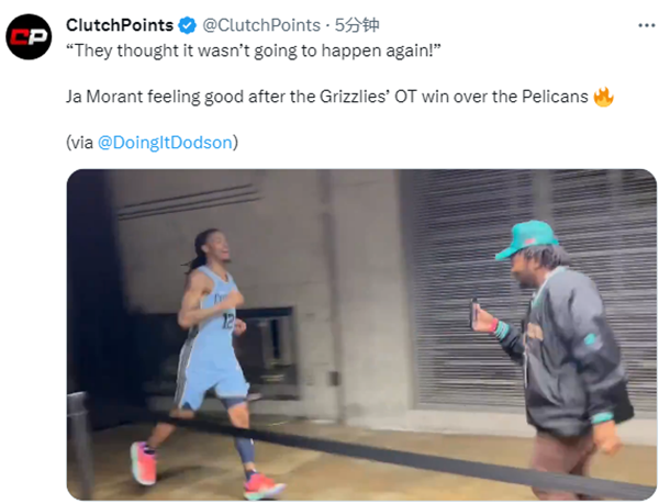 灰熊再次逆转鹈鹕赛后,莫兰特面带笑容、一路跑回更衣室,口中喊着:他们认为这种事(逆转)不会再发生了。