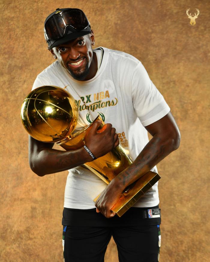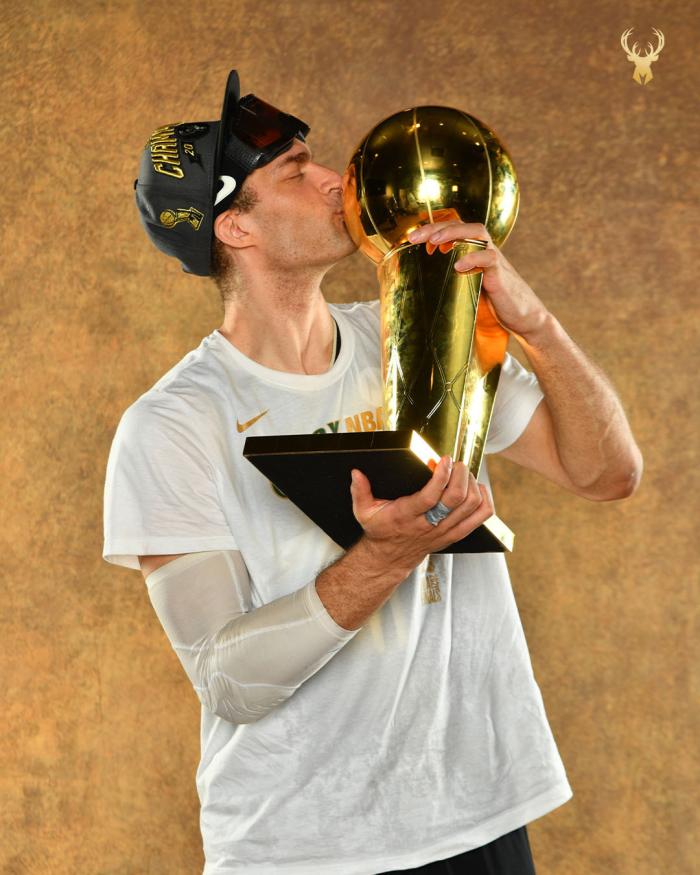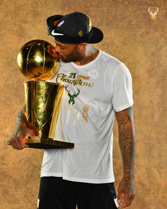 大洛佩兹则是举着奖杯并且亲吻总冠军奖杯,33岁大洛是雄鹿夺冠的首发中锋,今年季后赛场均贡献13分5.9篮板1.5盖帽。