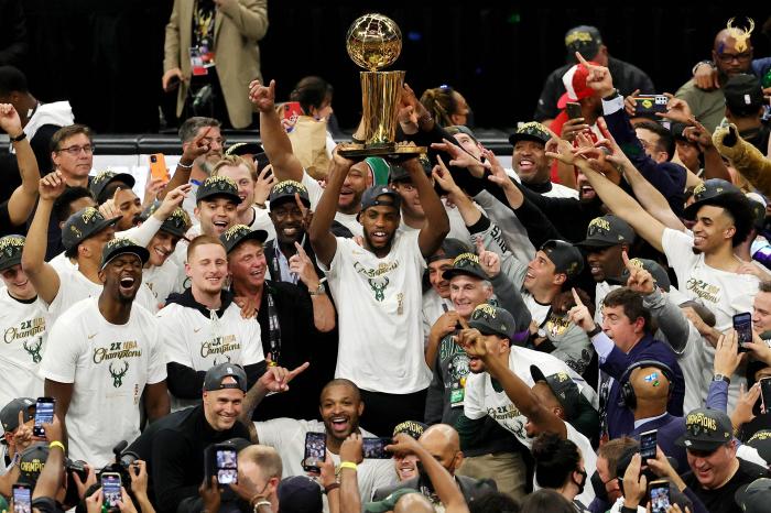 雄鹿总冠军定妆照出炉!将帅大笑塔克亲吻奖杯,字母哥抱双杯乐开怀