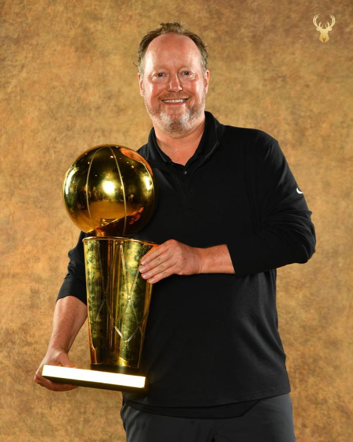 雄鹿主教练布登霍尔泽双手紧抱总冠军奖杯,一脸笑容。