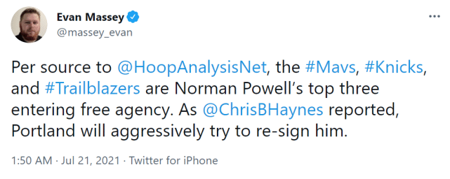 28岁的鲍威尔,将吸引多支球队的追逐,其中也包括开拓者。消息源透露,开拓者已经把续约鲍威尔当作球队休赛期的头号任务。另据NBA记者埃文-马塞报道,在鲍威尔进入自由球员市场后,他的前三选择将是独行侠、尼克斯和开拓者。