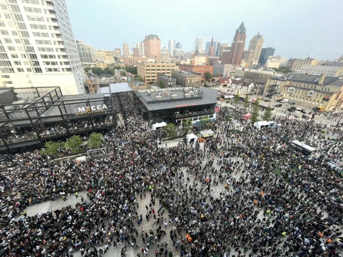此前雄鹿队在球馆周围布置了很多舞台和大屏幕以及其他主队元素,这就相当于是雄鹿主场的扩展,准备了一个更大的集中观赛区;目前雄鹿球馆外人山人海,现场挤满了球迷;很明显,他们都想亲眼见证雄鹿队的荣耀时刻,大概65000人聚集在一起。