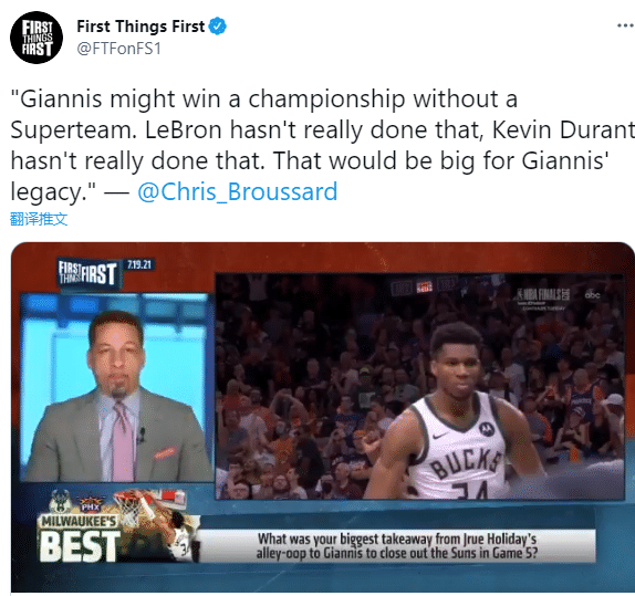 名嘴Chris Broussard在节目中表示:即使从未加入超级球队,字母哥仍可能赢得一个总冠军,詹姆斯没有真正做到这一点,杜兰特也没有做到,这对字母哥的历史地位意义重大。