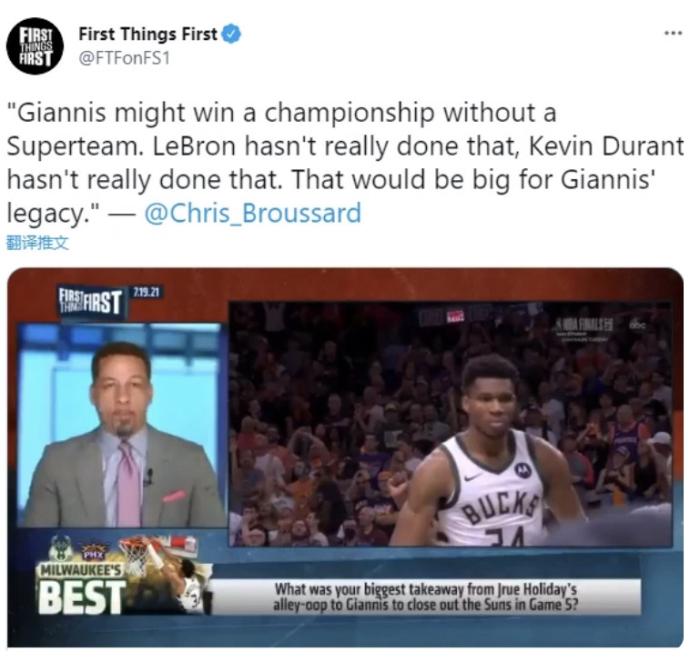 相对于CHRIS的评论,美国杨毅A史密斯的评论更加的直白,史密斯表示,字母哥是NBA这个时代所需要的球星,当所有人都在抱团的时候,他没有选择离开雄鹿加入超级球队,他是一个伟大的球员,一个优秀的榜样,他值得所有的荣誉。