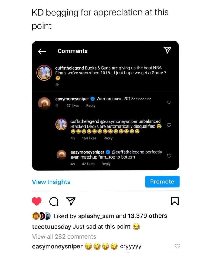 来源:JRS直播网07-19 18:20JRS直播网讯 最近杜兰特在互联网上可是非常的忙,前有和网友在语音聊天室中争论,最近杜兰特又和网友在互联网上进行关于总决赛的互动。此前一位网友在互联网上说:今年的NBA总决赛是2016年之后最精彩的总决赛,希望能够打到7场比赛。而杜兰特则在这位网友下面评论道:2017年勇士VS骑士远大于今年。然后该网友回复到:实力悬殊的总决赛应该被自动排除。而杜兰特马上回复到:完全势均力敌的较量,老哥……从上到下都是如此。