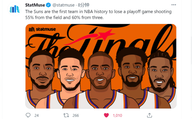 而太阳则非常尴尬,这场比赛他们的投篮命中率高达55.2%,三分命中率更是达到68.4%!据statmuse统计,太阳成为NBA季后赛历史首支投出55%命中率和60%三分命中率但仍然输球的球队!