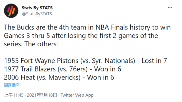 据统计,雄鹿是NBA历史第4支在总决赛0比2落后的情况下连赢3场的球队,前三支是1955年的活塞、1977年的开拓者以及2006年的热火。