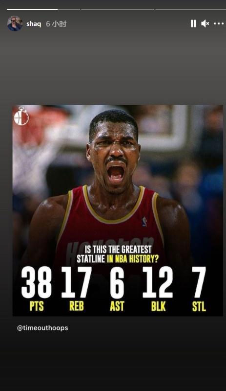 来源:JRS直播网07-19 18:03JRS直播网讯 北京时间7月19日,NBA传奇中锋奥尼尔更新社媒动态,晒出了一张奥拉朱旺曾打出的单场梦幻数据:38分17板6助12帽7断。