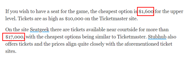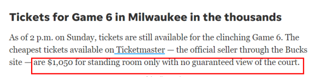 据密尔沃基当地媒体报道称,在Ticketmaster上最便宜的站票目前价格是1050美元,而且无法保证能看到球场。换句话说,花这么多钱得到一张站票,只能确保你站在球馆的某个位置,感受现场的气氛,但你未必能亲眼看到球场上的一切,很可能只是站在那儿看大屏幕而已。